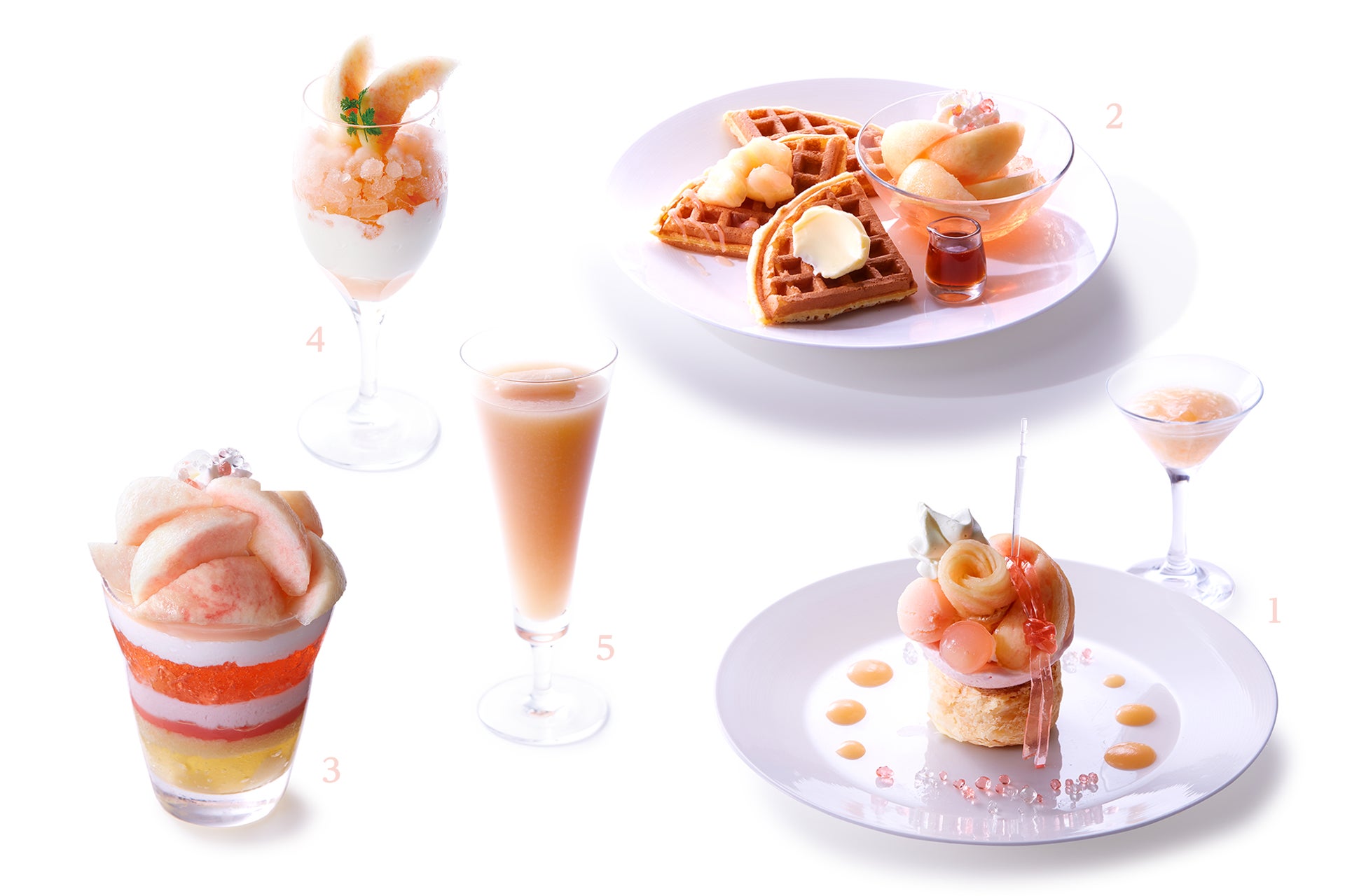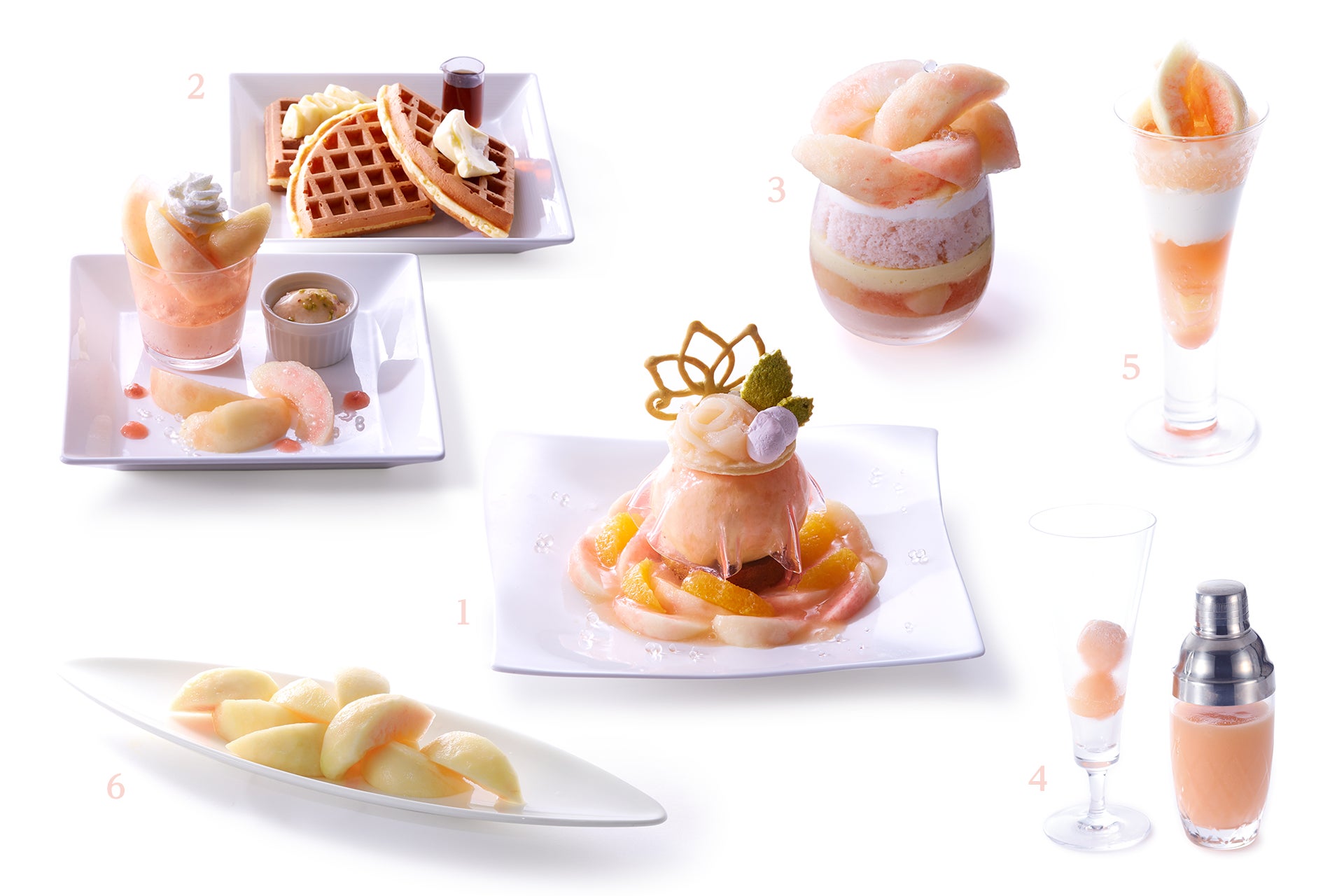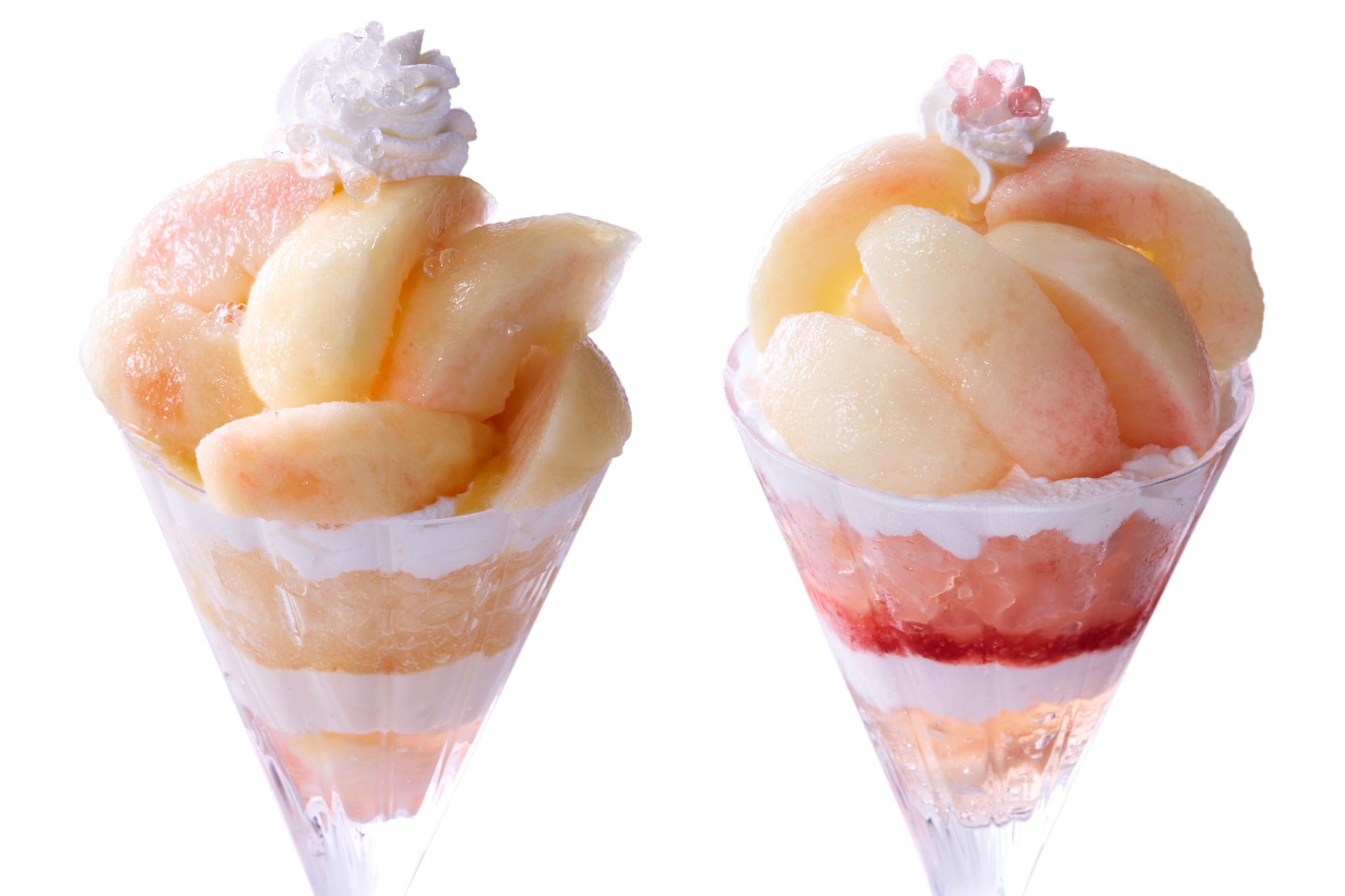 夏の時期にお届けするのは「桃」のラインナップです。ひんやり冷たいパフェや、桃の果肉を楽しめるデザートからジュースまで、お好みの仕立てを選べます。